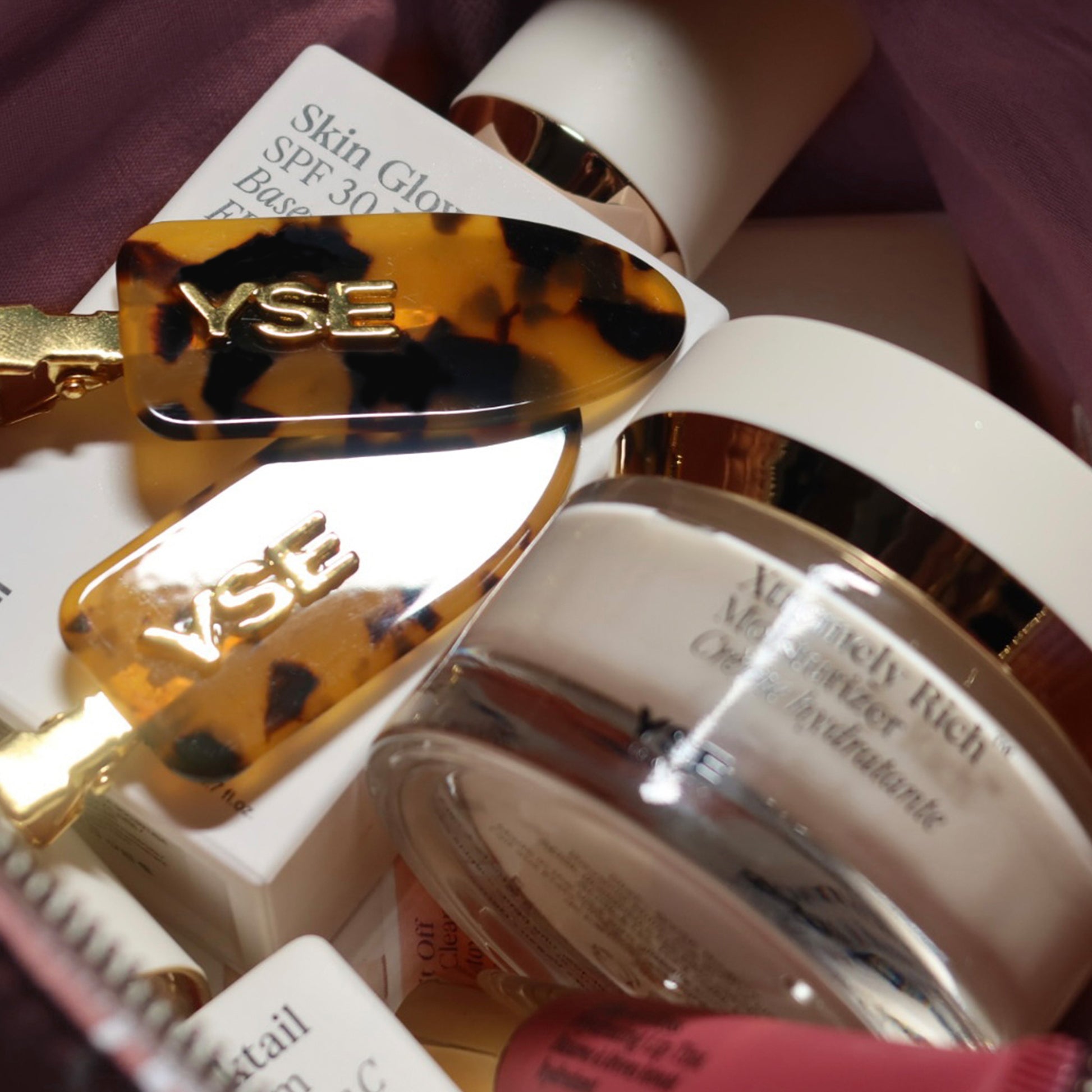 Chic enough to wear wherever: two crease-free tortoiseshell hair clips with a gold YSE Beauty embellishment.