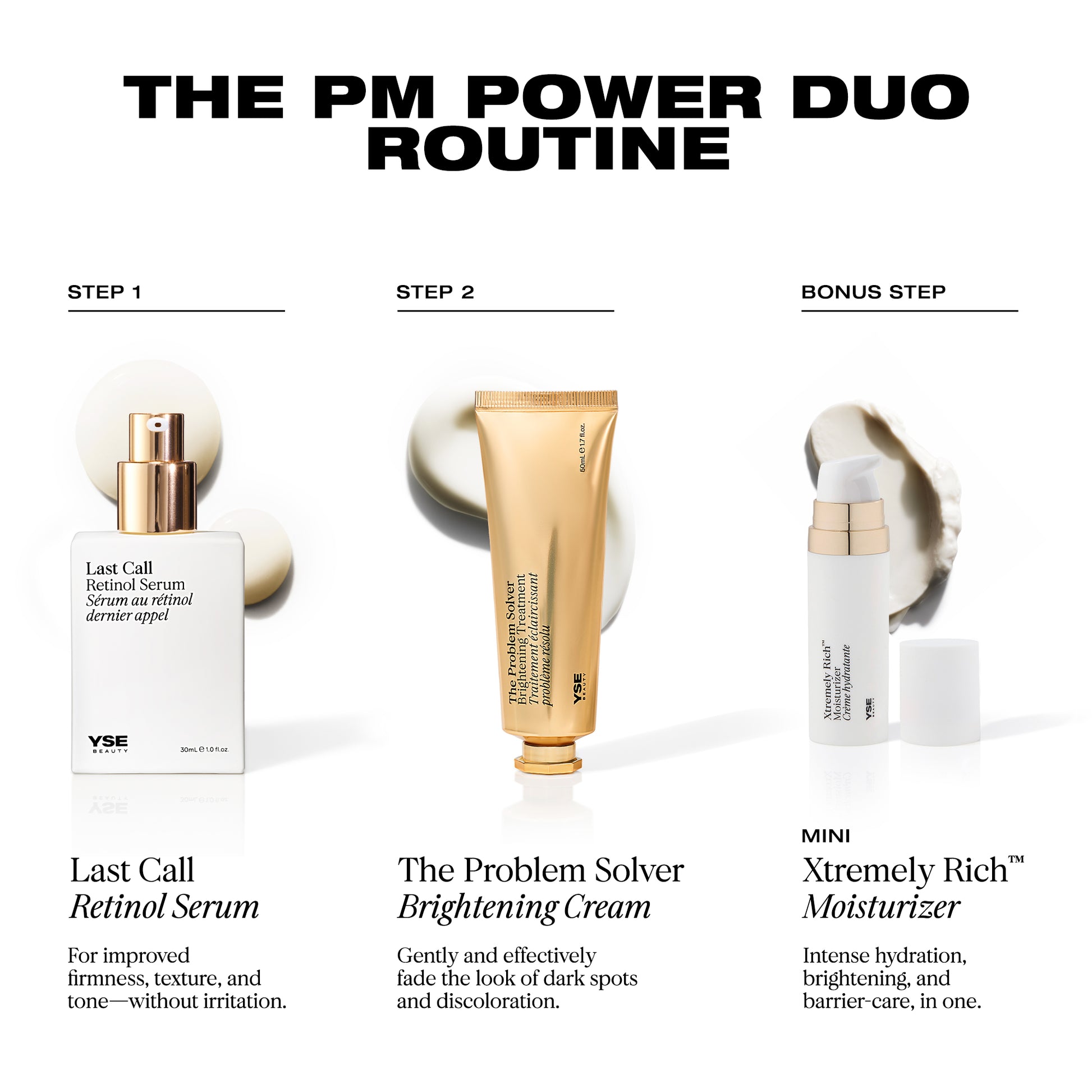 The PM Power Duo gets down to business while you sleep, featuring two full-size heavy hitters that work better together to deliver brighter, firmer, more even-looking skin—all without irritation. Also included is a Mini Xtremely™ Rich Moisturizer for added brightening benefits plus intense hydration and barrier support.
